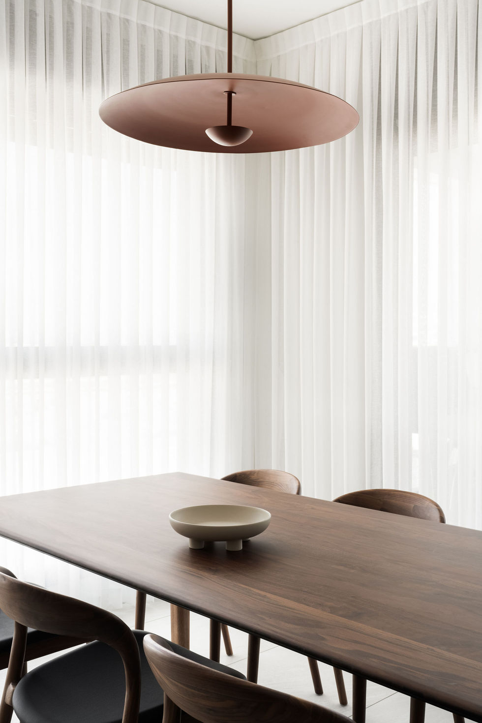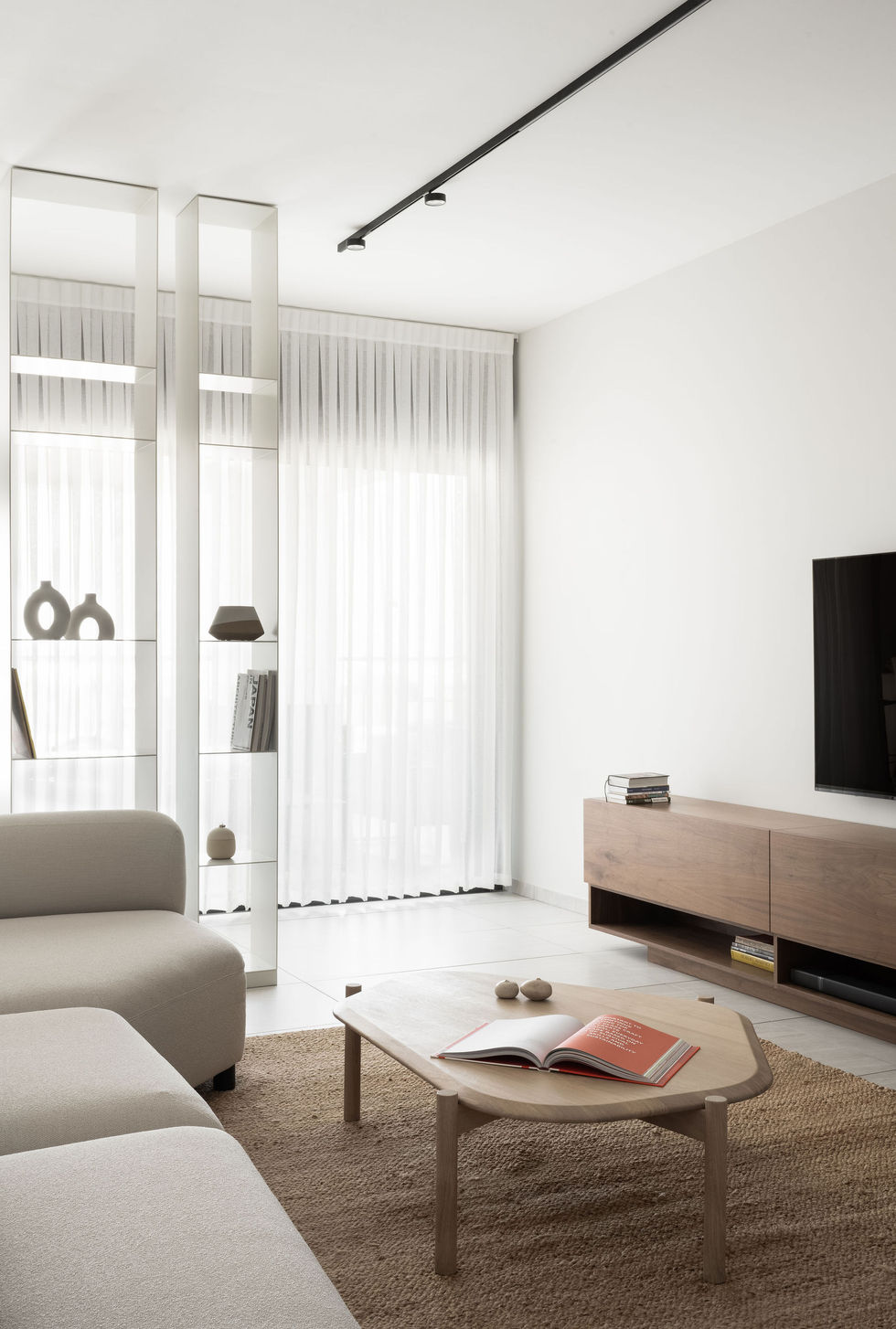 A couple sought our help in designing their new apartment, with a special emphasis on the communal spaces. The living room in the apartment was quite deep. Our aim was to pull the sofa away from the wall without giving the impression of it being "floating" or exposed, while leaving a long, bare wall in the background. We designed a metal library that serves as an anchor for the living room design in the center of the space, allowing a glimpse into the kitchen and providing a platform for the clients' books and accessories. By detaching the seating from the wall, we created a circular movement around the sofa, allowing us to cover the entire wall, from floor to ceiling. The covering features an embossed pattern in a matching tone to the wall, creating a subtle, almost imperceptible texture that complements the flow of movement into the space.